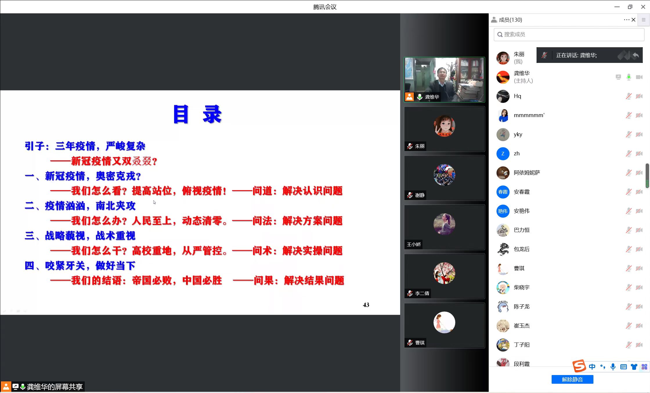 龚维华书记从疫情的产生、发展、社会影响入手,梳理了当前疫情对国际局势、中国社会发展和高校工作产生的深远影响,强调了坚持党的全面领导、坚持外防输入、内防反弹、坚持“动态清零”政策的重要性。特别讲到当前全国疫情尤其是北京疫情十分严峻,全体师生要进一步统一思想、提高认识,坚定不移“听党话、跟党走”,坚持校自为战,坚决克服轻视、无所谓、自以为是等思想,始终保持清醒头脑,坚决把疫情防控作为当前公司工作的重中之重,坚决筑牢校园疫情防控屏障。
