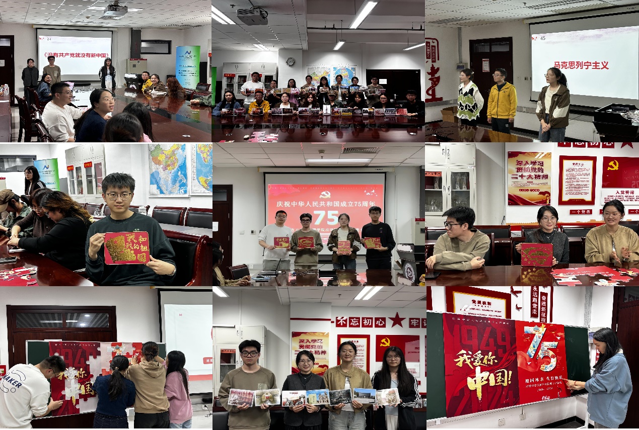 活动环节,支部成员以小组的形式依次进行“共猜一道谜”、“共捋一条线”、“共绘一幅画”和“共拼一组图”活动体验。师生通过共同手势比划猜历史人物、历史事件、历史地点和历史故事,共同看图识别并串联1921年至1949年间的重大历史事件,共同绘制“厉害了我的国”、“爱我中华”、“中国梦”和“我和我的祖国”等主题的手工金箔画作品,共同拼图完成两组庆祝中华人民共和国成立75周年的祝福海报等活动形式表达对祖国的美好祝愿。