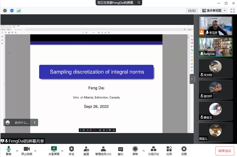 9月27日上午,应yl23455永利集团邀请,加拿大阿尔伯塔大学数学与统计学系副系主任、博士生导师戴峰教授通过线上腾讯会议作了题为“Sampling discretization of integral norms”的学术报告。yl23455永利集团四十余名师生聆听了报告。